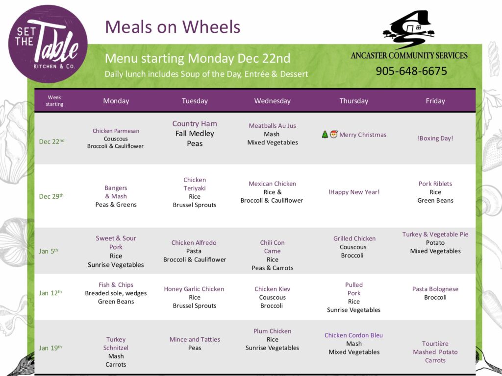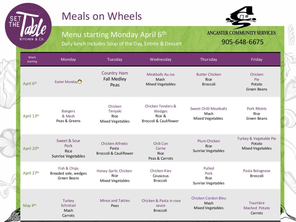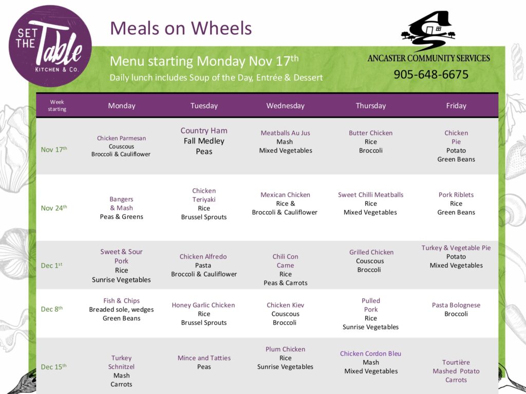 A regular meal in Ancaster requires 24 hours notice to initiate or cancel the meal program.