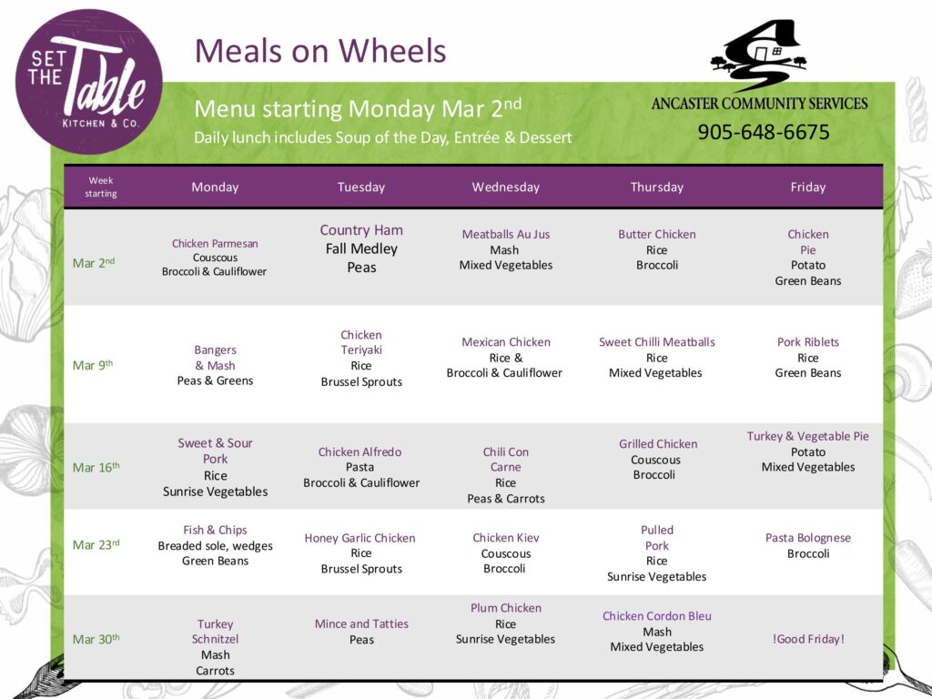 A hot mid-day meal (prepared by Set The Table Kitchen & Co.) is delivered by volunteers Monday to Friday. The cost is $8.00 per meal and clients are invoiced at the end of every month. Meals can be delivered once a week or any combination of days. There is no weekend or holiday delivery.